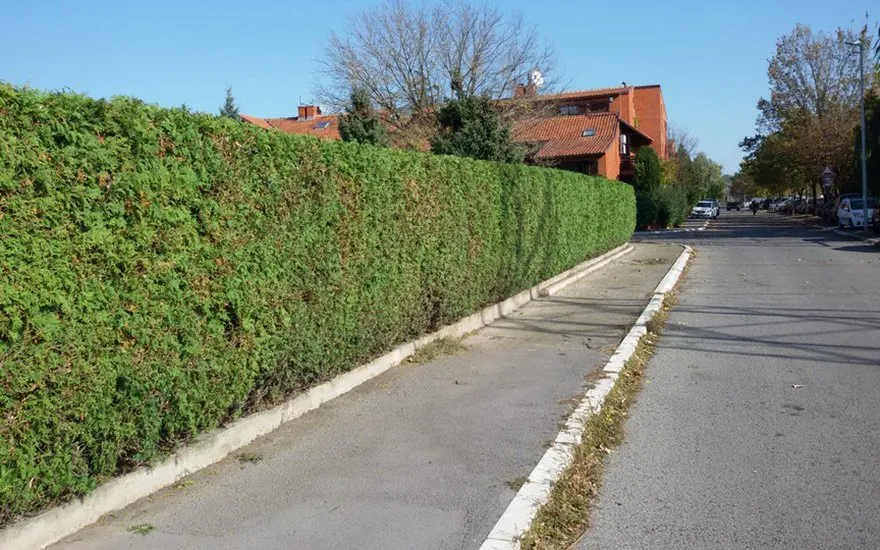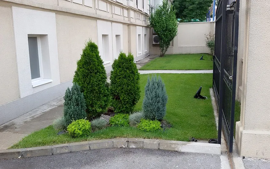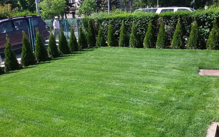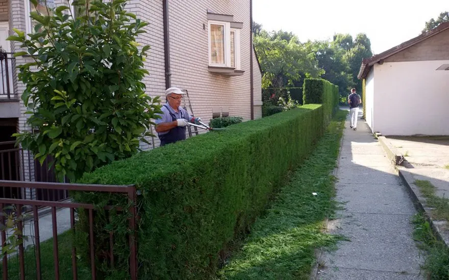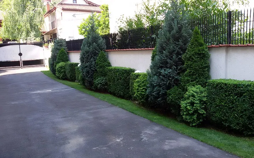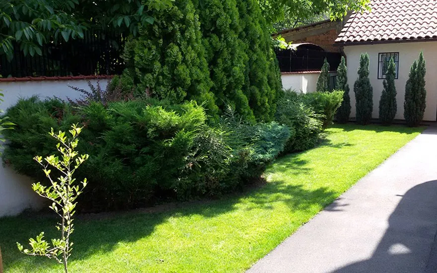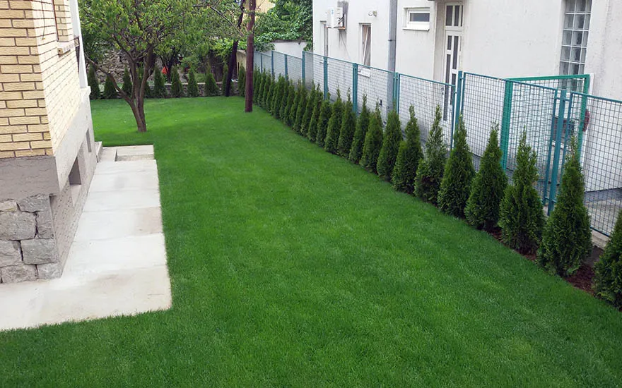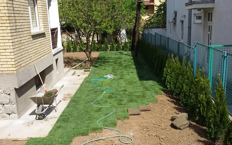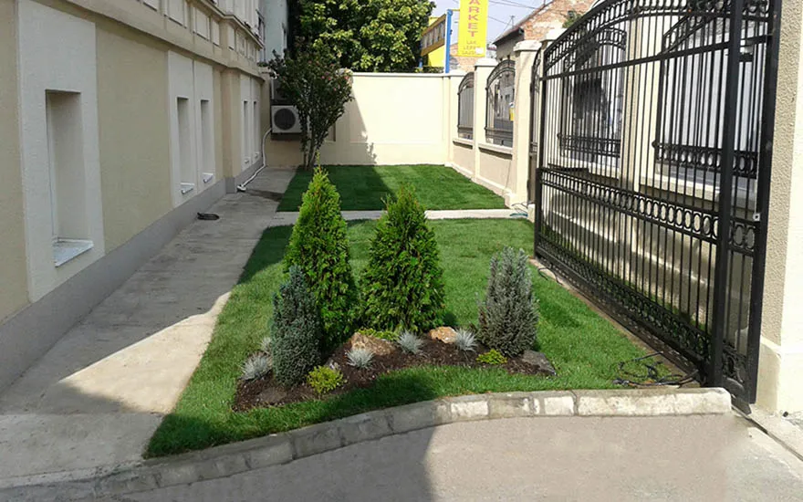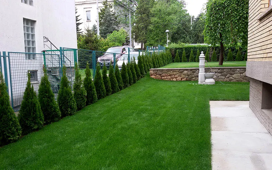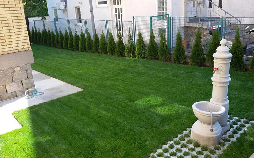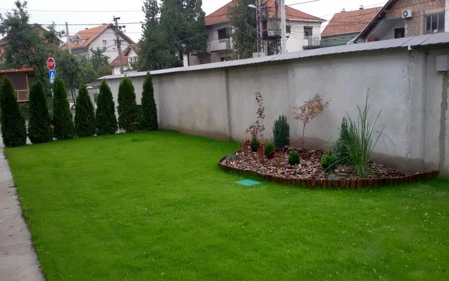 Izgled privatnog dvorišta u Beogradu posle izvedenih pripremnih radova obrade zemlje i završnih radova postavljanja tepih trave i sadnja tuja u nizu radi formiranja žive ograde