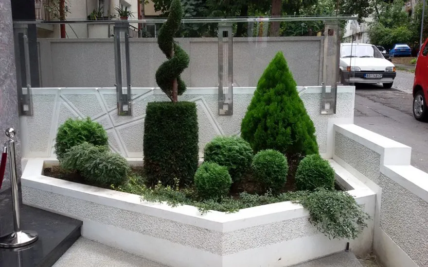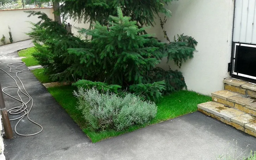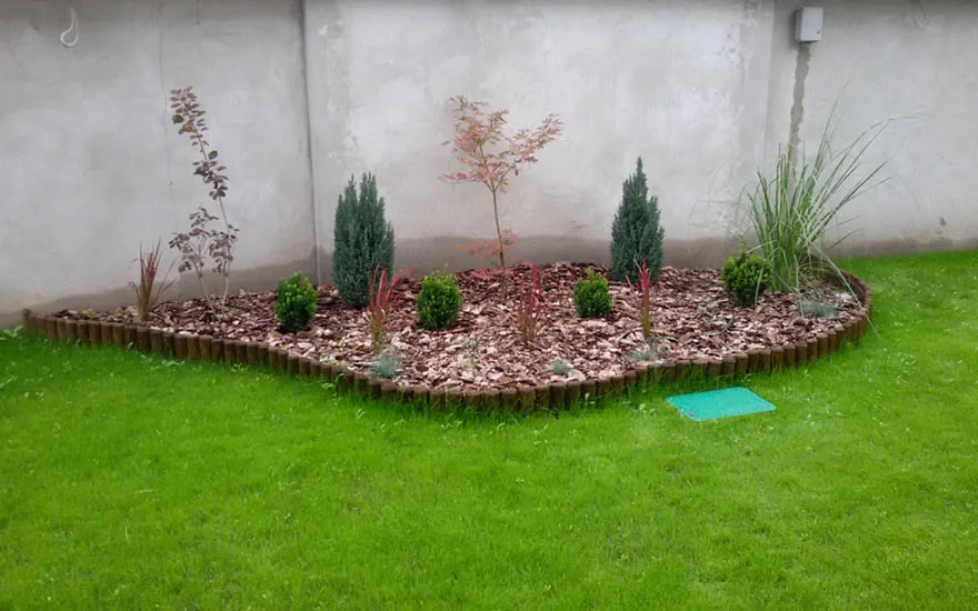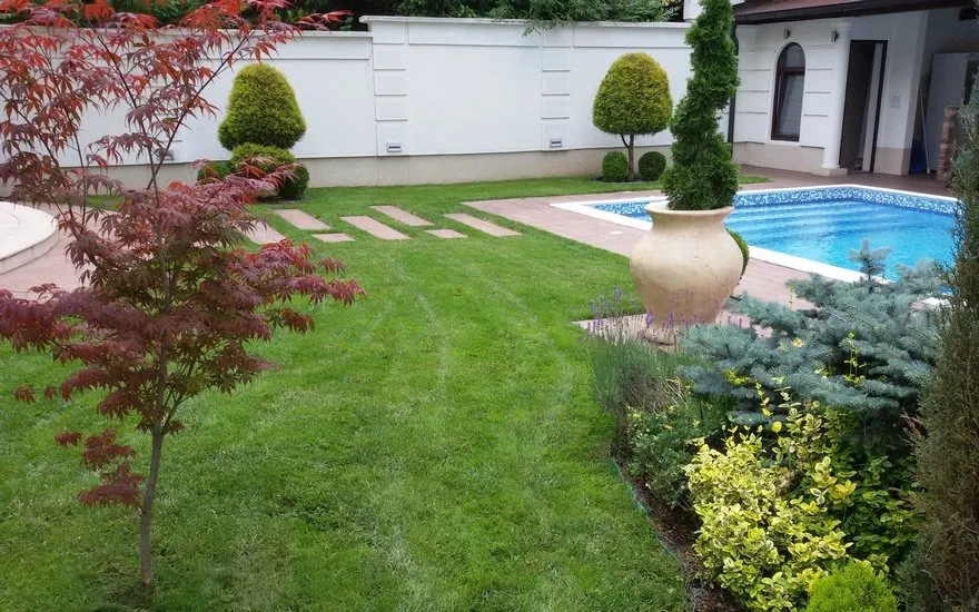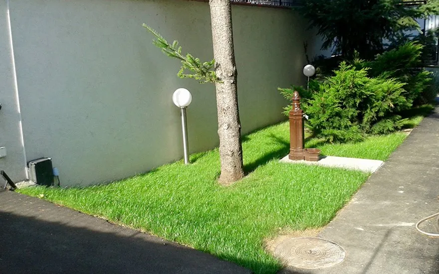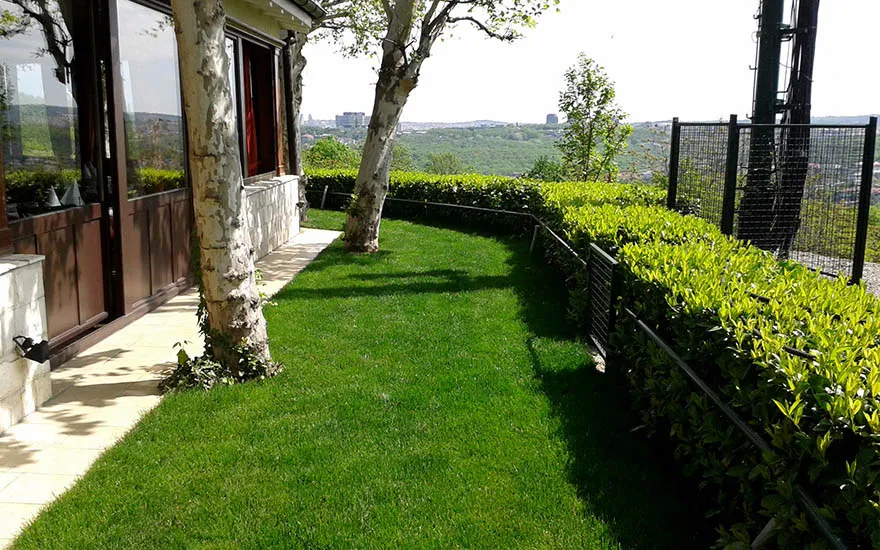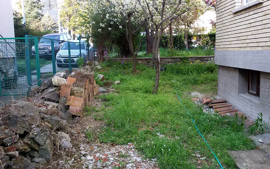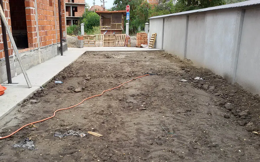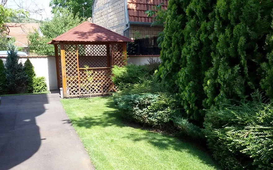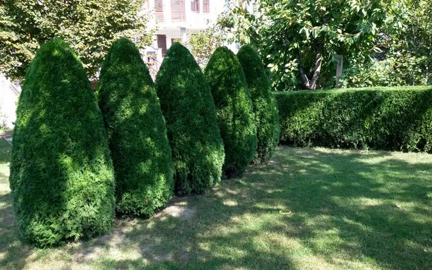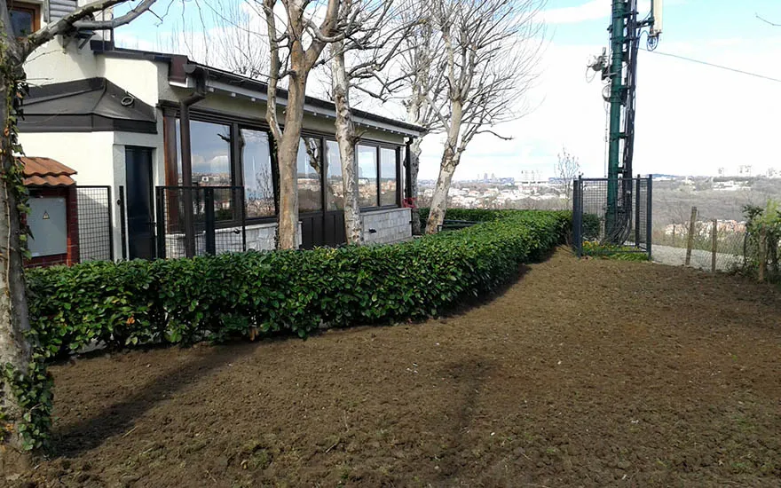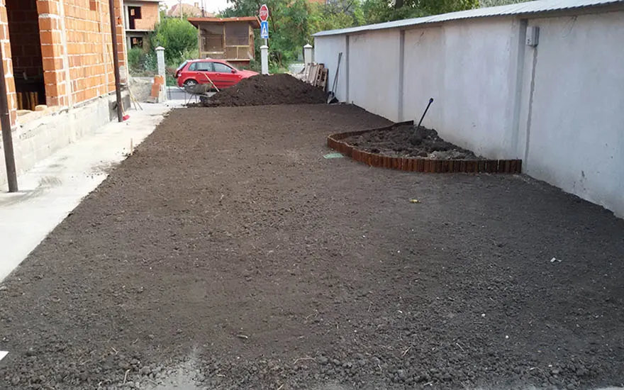 Izgled privatnog dvorišta u Beogradu posle izvedenih pripremnih radova obrade zemlje i završnih radova postavljanja tepih trave i sadnja tuja u nizu radi formiranja žive ograde