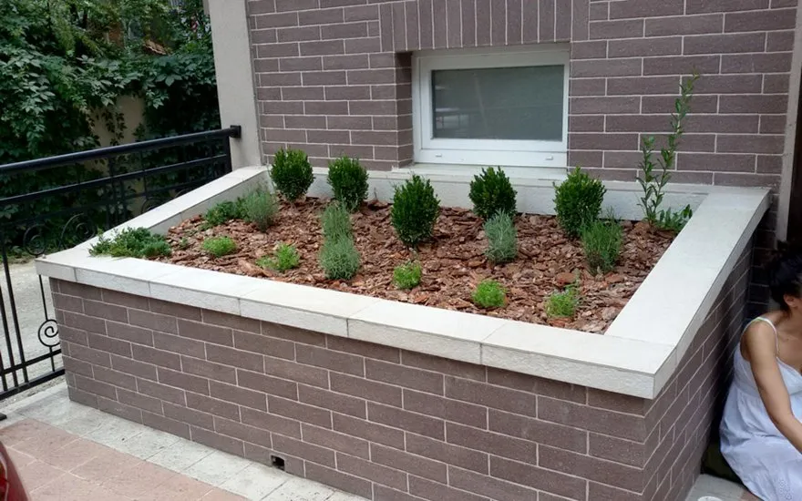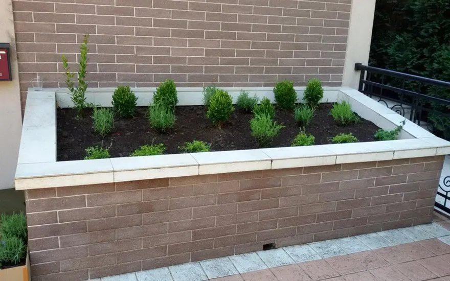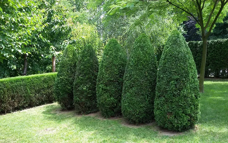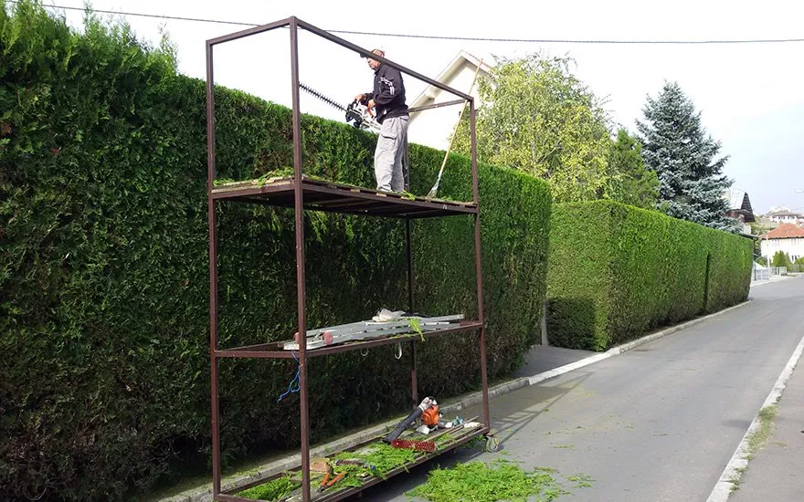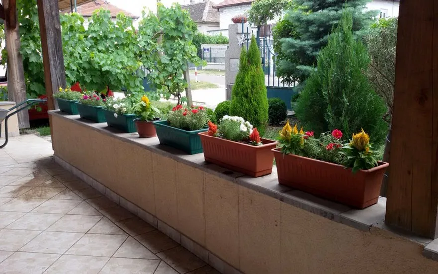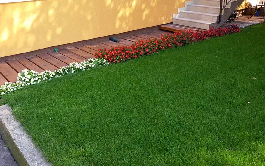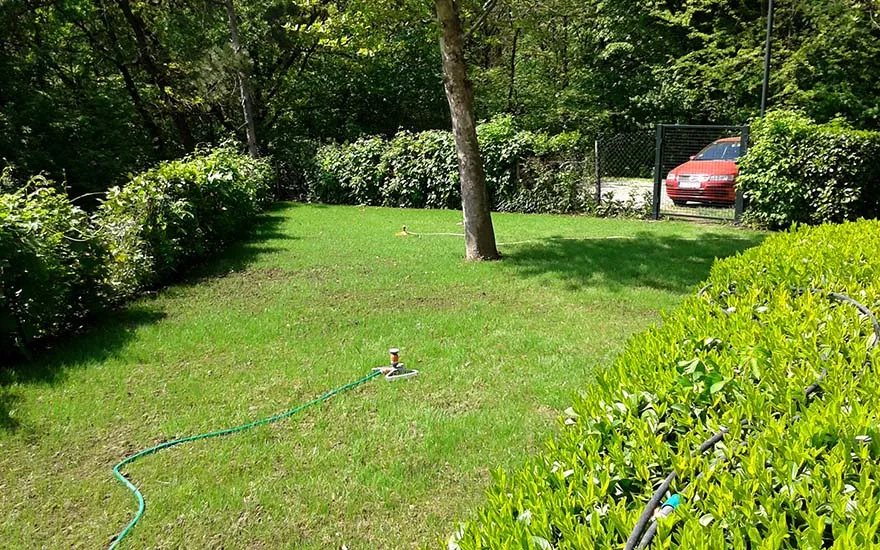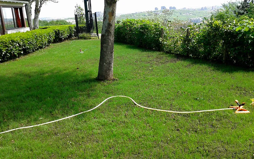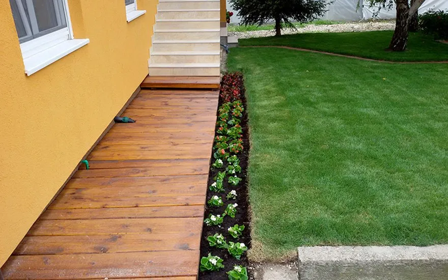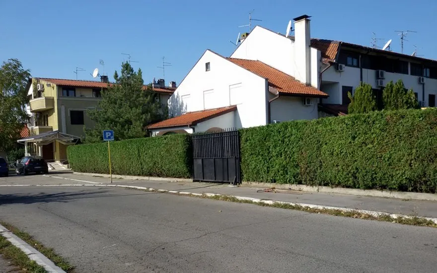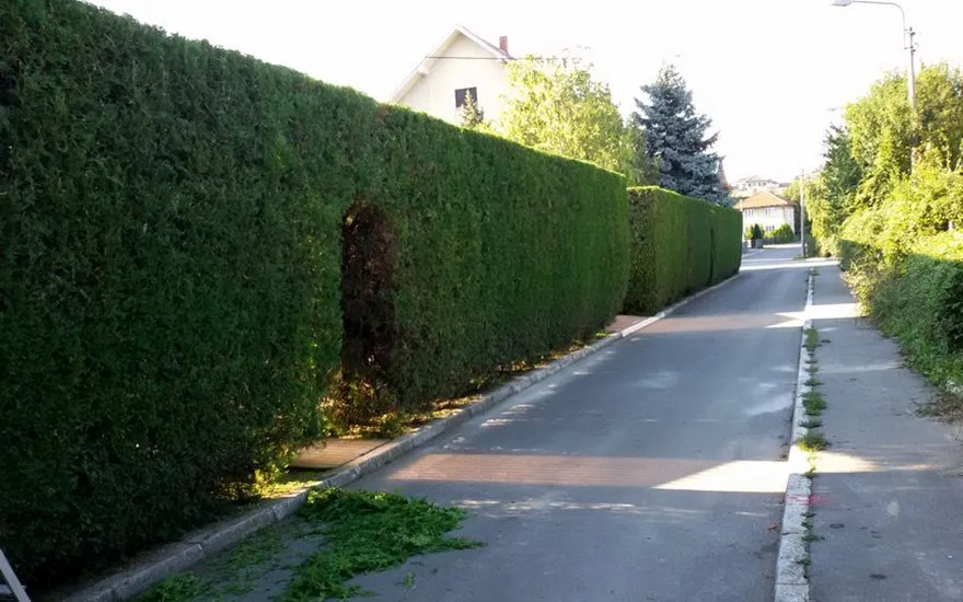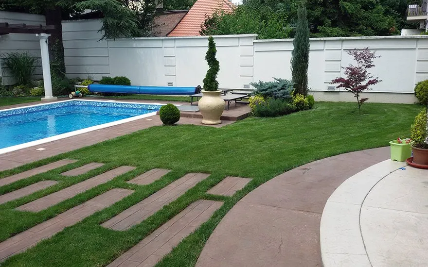 Izgled privatnog dvorišta u Beogradu posle izvedenih pripremnih radova obrade zemlje i završnih radova postavljanja tepih trave i sadnja tuja u nizu radi formiranja žive ograde
