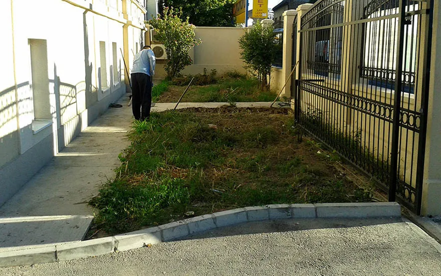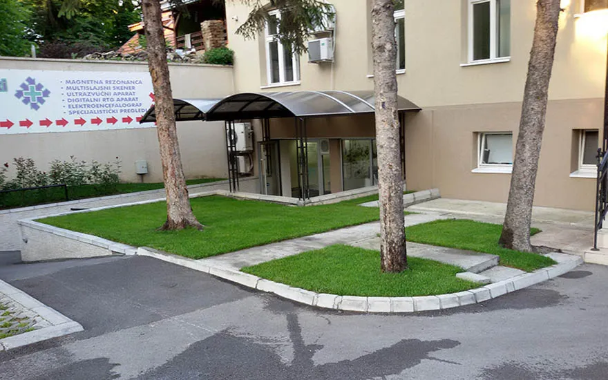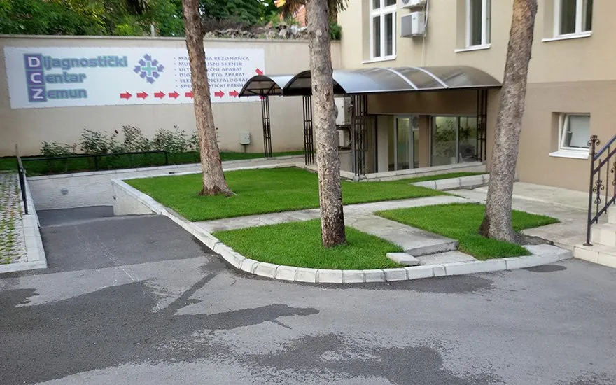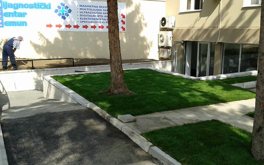 Uređenje dvorišta 'Dijagnostički Centar Zemun' izrada 'alpinetum-a' na ulazu u dvorište, postavljanje gajenog busena trave i setva travnog semena u drugom delu dvorišta
