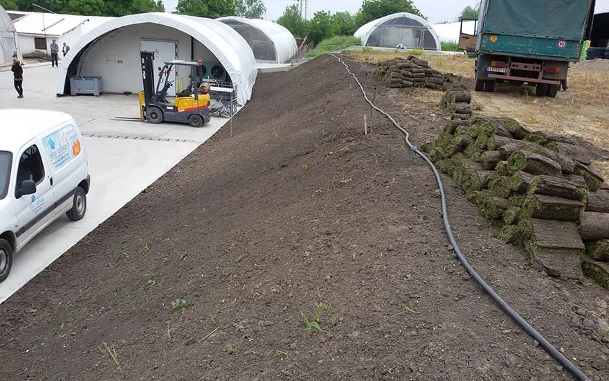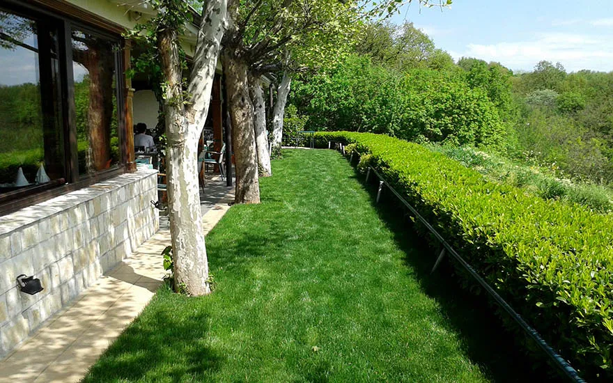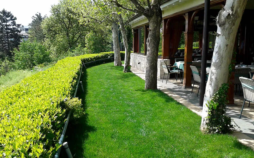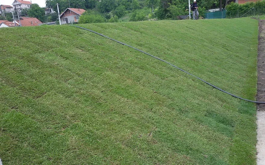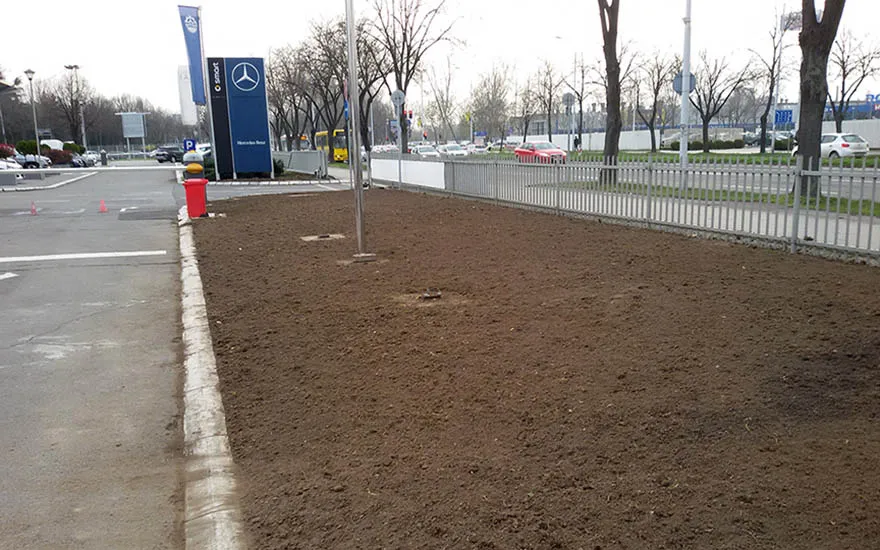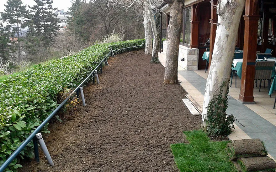 Fotografije pripremnih i izvedenih radova uređenja zelenih površina postavljanjem gajenog busena trave (tepih trava) i setvom travnog semena. Restoran "RUBIN", Košutnjak - Beograd